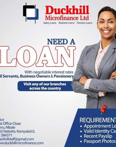 Duckhill Microfinance Limited is a licensed, non-deposit-taking financial institution in Uganda (License #UMRA01927ND), regulated by the Uganda Microfinance Regulatory Authority (UMRA). Based in Mbale with branches like Wobulenzi, it specializes in salary loans for civil servants and business loans, including loan buyout options.